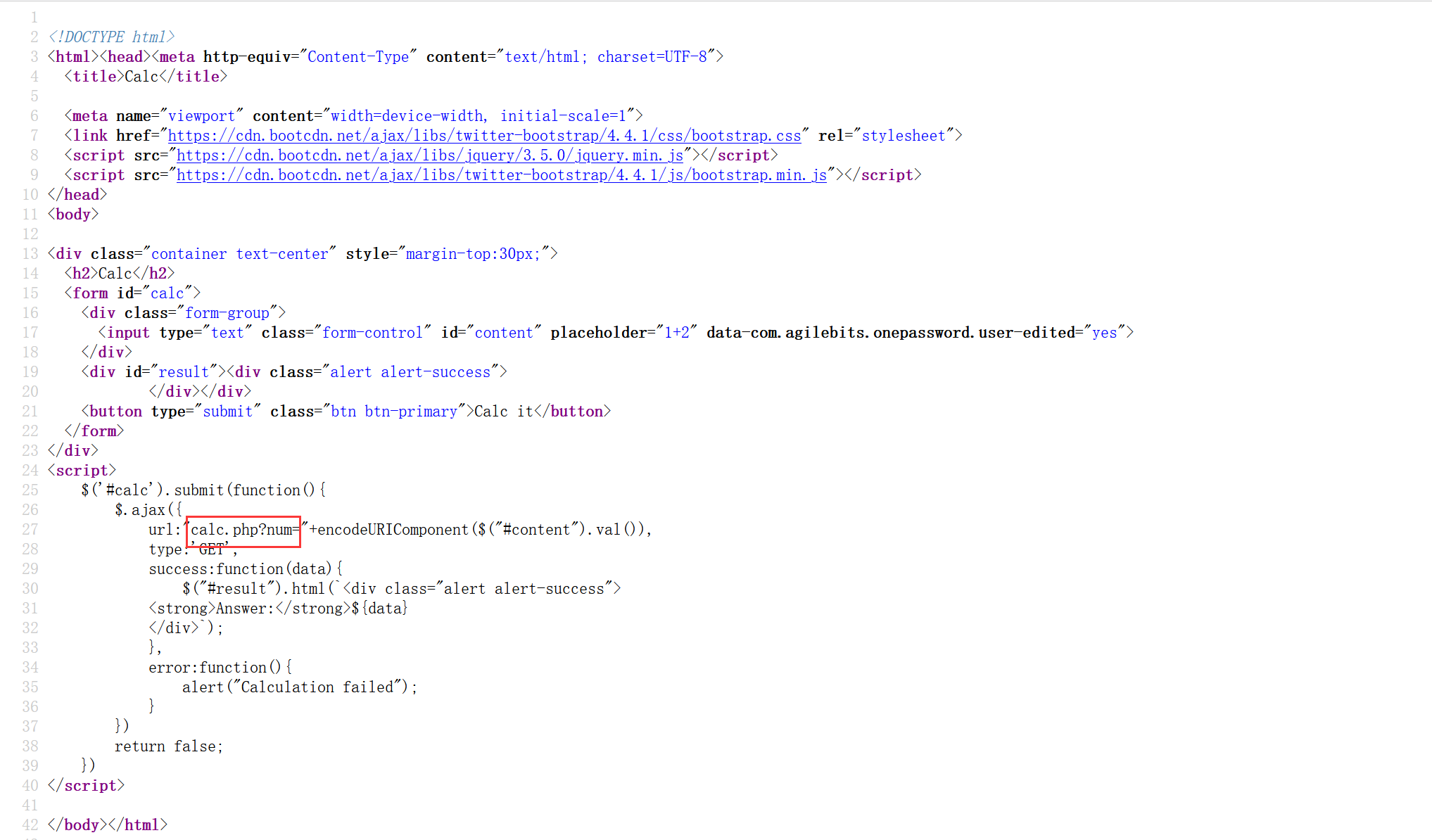 查看源代码可以发现关键词calc.php